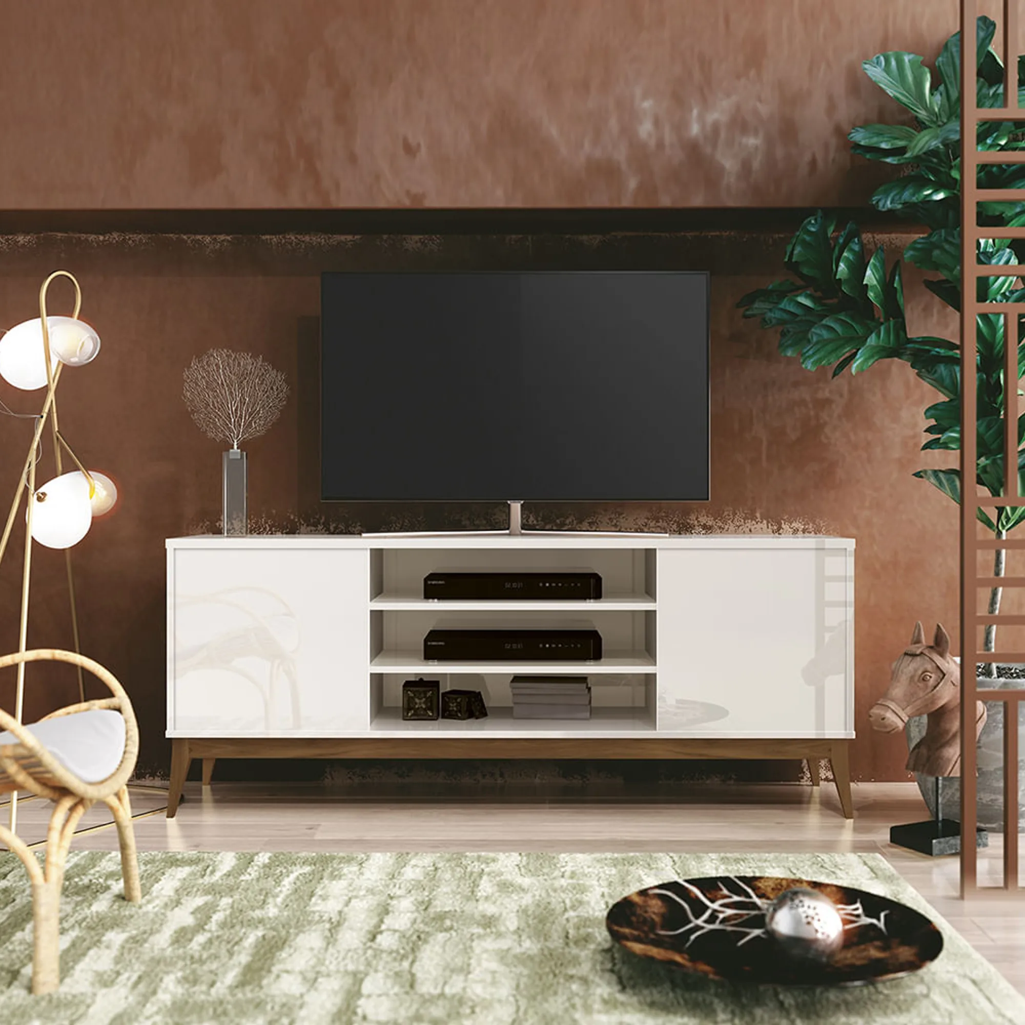 Rack Titan vai deixar sua sala moderna e elegante. Possui 2 portas de abrir, sem prateleira interna, pés de madeira maciça para garantir toda qualidade e durabilidade e prateleiras para acomodar até 03 aparelhos variados. Ah! Tem espaço para TV até 60 Polegadas. Show, não é?